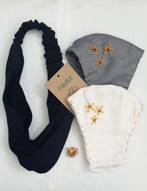 Combo 2 Khẩu Trang Linen Thêu Có Ngăn Chứa Lớp Kháng Khuẩn + Băng Đô Xám.
