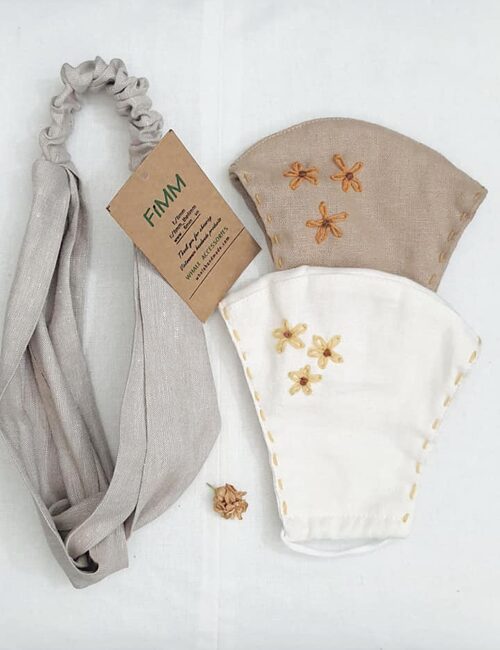 Combo 2 Khẩu Trang Linen Thêu Có Ngăn Chứa Lớp Kháng Khuẩn + Băng Đô Kem