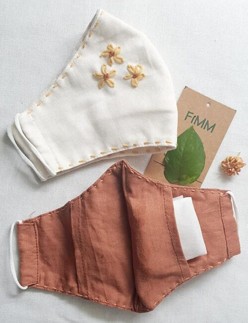 Combo 2 Khẩu Trang Linen Thêu Có Ngăn Chứa Lớp Kháng Khuẩn + Băng Đô Nâu