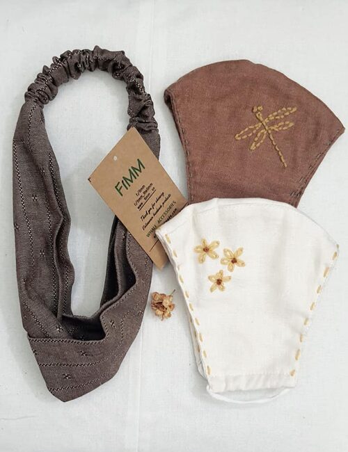 Combo 2 Khẩu Trang Linen Thêu Có Ngăn Chứa Lớp Kháng Khuẩn + Băng Đô Nâu