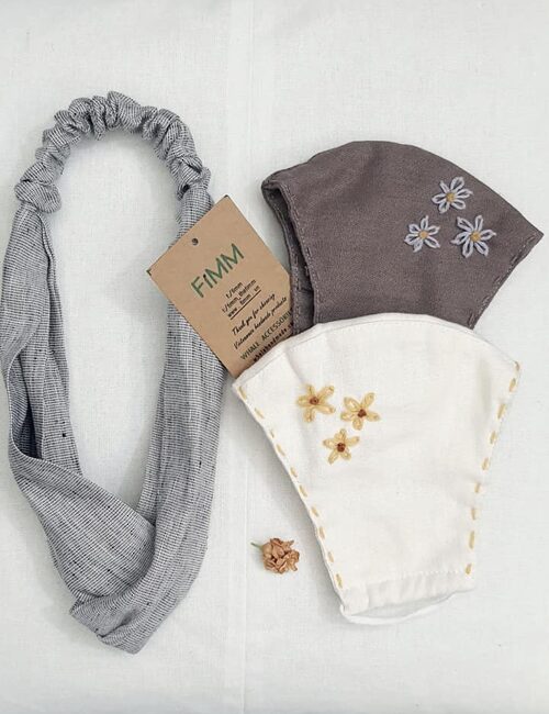Combo 2 Khẩu Trang Linen Thêu Có Ngăn Chứa Lớp Kháng Khuẩn + Băng Đô Xám.