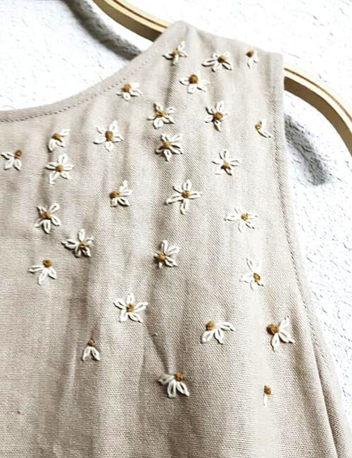 Đầm linen kem sát nách thêu hoa cúc dại nhí