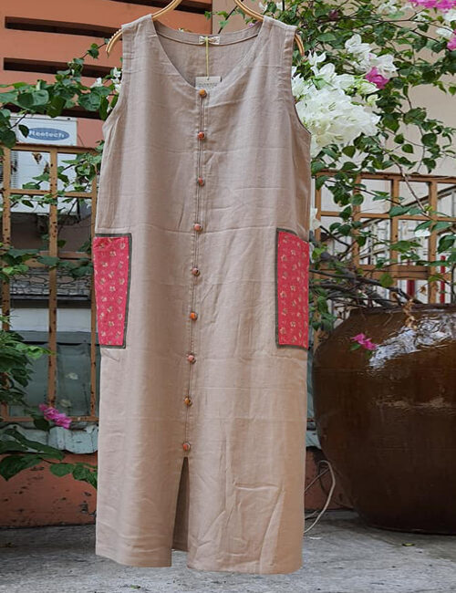 ĐẦM LINEN THIẾT KẾ NÚT GIỮA, HAI TÚI PHỐI HOA NHÍ GAM ĐỎ FIMM
