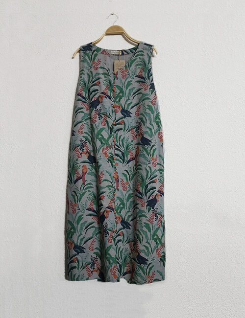ĐẦM SUÔNG LINEN CỔ TIM HỌA TIẾT CHIM MUÔN NHIỆT ĐỚI *tạm hết*