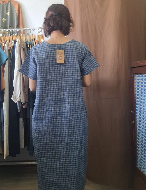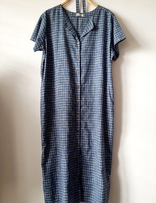 Đầm Ve Lật. Gam xanh xám, chất linen họa tiết caro vẽ nét lệch tự nhiên. Ngực 110cm, dài 110cm